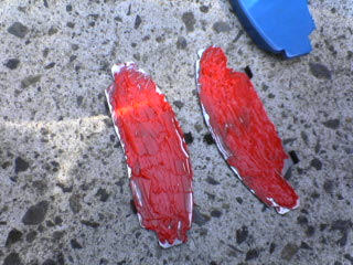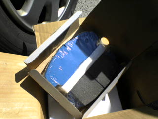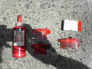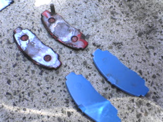 | 5 | 外れたパッドとこれから付けるパッド 以前使っていたのはGLADのパッド(赤)です ノーマルのパッドには減りを知らせるインジケーター(鉄の突起物)があるのだが、今回のにはなかった もし付けるパッドに装着されている場合は、裏面に装着する |