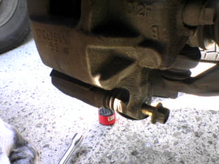 まずはジャッキアップしタイヤホイールを外す このとき、フロアージャッキを使ってウマで上げておきましょう。 パンタジャッキなどで一点支持では危険かと思われます また、、ブレーキレザーバータンクをあけ、いくらかブレーキフュルードを抜いておきます (キャリパーピストンを押し戻すとその分、タンクに戻るためです) |