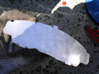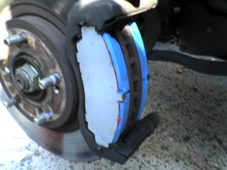 | 9 | シムとパッドを組み付け、キャリパーに戻します その後、キャリパーピストンを戻します オレの場合は使わなくなったパッドをピストンにあて両手で押し戻しました、結構力がいります もしくはCクランプやウォータープライヤーで挟み込み、徐々に力を加えて挟み戻します(このとき傷が付かないように布などで保護してから行います) |