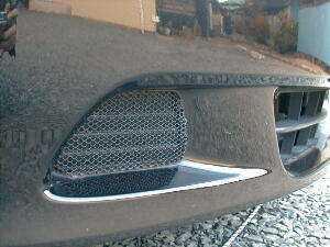 本来ならフォグランプが納まる所なのだが、無いと蓋がしてあるという情けない箇所 自転車の買い物かごを加工し四隅の穴に咬ましただけという、お手軽チューン そのうち、エアクリまでダクトを通しインテークとして加工する予定 |