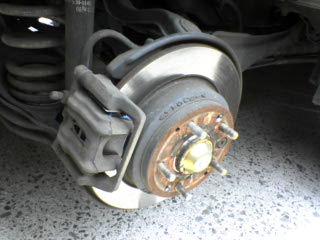 | 5 | キャリパーの裏の台座(付け根)に17mmのボルトが上下一箇所ずつありますので、それを外す(かなり固いです) キャリパーがフリーになるので、針金などでつらす(ホースに無理が掛からないように) その後、ローター中央(ハブボルトの間)のある大きな皿ビス二本を外し、ローターを手前に引くと写真のような状態になります |