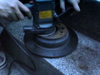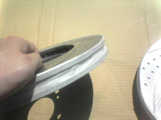 | 3 | まずは購入したローターの塗装から始めます 塗装に先立ち、塗装面を600番くらいの耐水ペーパーで足付けのため磨く、んで前面をシリコンオフで脱脂 (熱を持つ部分なので、シーラーなどの下地処理はしていません) サイドをマスキングして塗り分けようと思ったのですが、めんどくさくなり、下のような結果に(汗) まー当たり面は削って出すのでノープロブレムです |