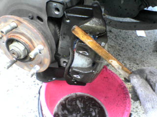 | 6 | 本当はキャリパーも降ろして作業しようかと思ったのですが、エア抜きが面倒なので、つるしたままブラシで磨くの図 カーシャンプーで汚れを落とし、その後ブレーキクリーナーで更にやってます でも、10万km走行の汚れはなかなかに落ちず 結局は、汚れが全て落ちるまでの作業は行わず、そこそこのまま、塗りに入る |