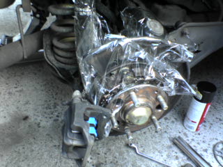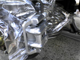 | 6 | 一応、ラップでフットブレーキ(ドラムブレーキ)部をマスキング、また車体側もマスキングしてます そして、充分とは消して思えない洗浄も終了(爆) |